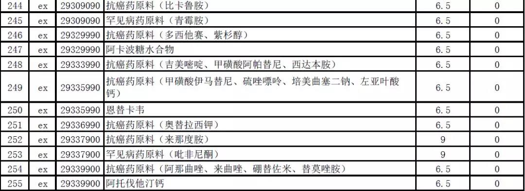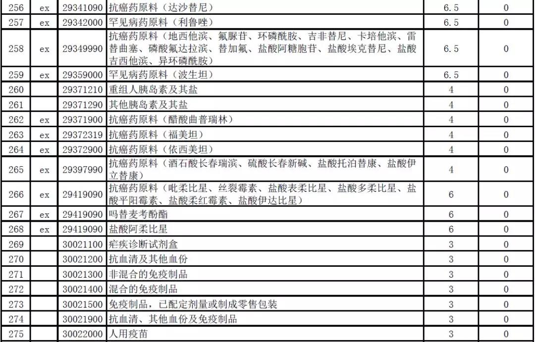 值得注意的是,在706項進口暫定稅率調整商品中,地西他濱、奧替拉西鉀、來那度胺等多種抗癌藥原料和青霉胺、吡非尼酮、利魯唑、波生坦等多種罕見病藥原料將實施零關稅。此外,即將實施零關稅的藥品還包括了胰島素、免疫制品、抗血清及其他血份、人用疫苗、遺傳物質和基因修飾生物體、具有抗癌作用的含有生物堿及其衍生物的藥品等。